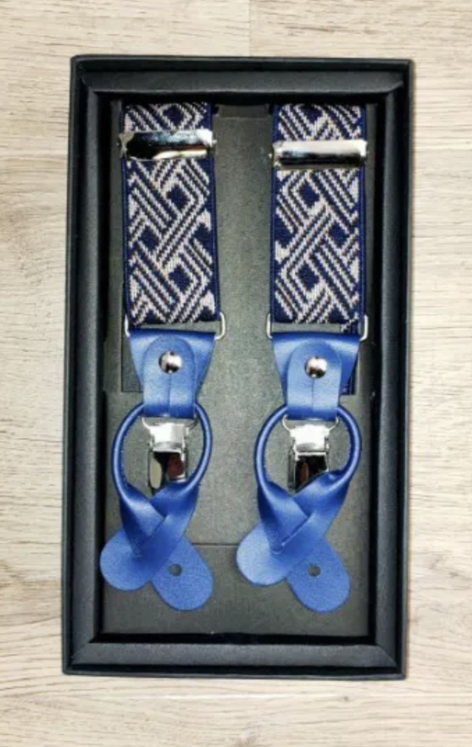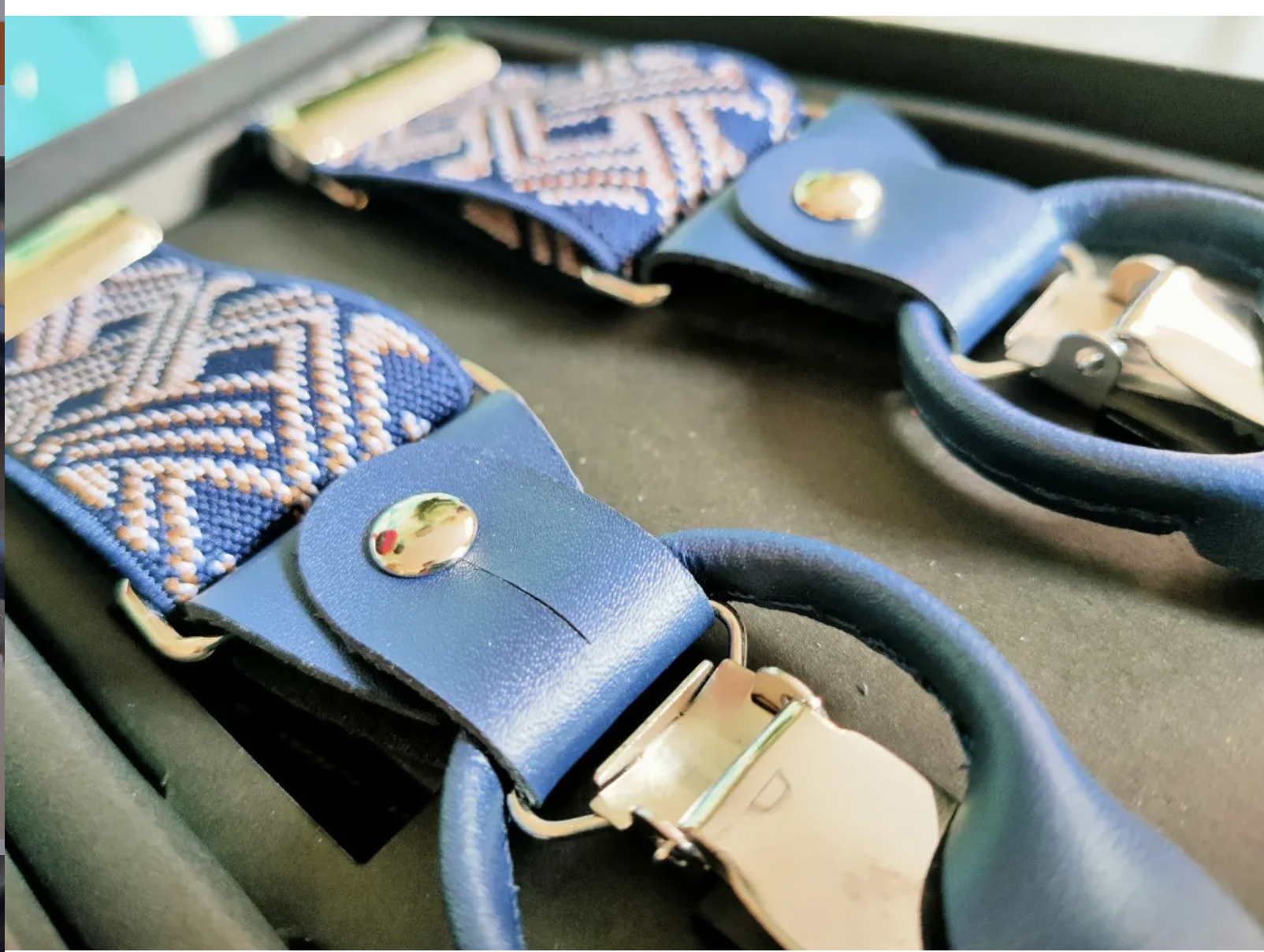 Attaches : croûte de cuir bleu ET pinces métalliques (acier inox) – interchangeables / modulables.