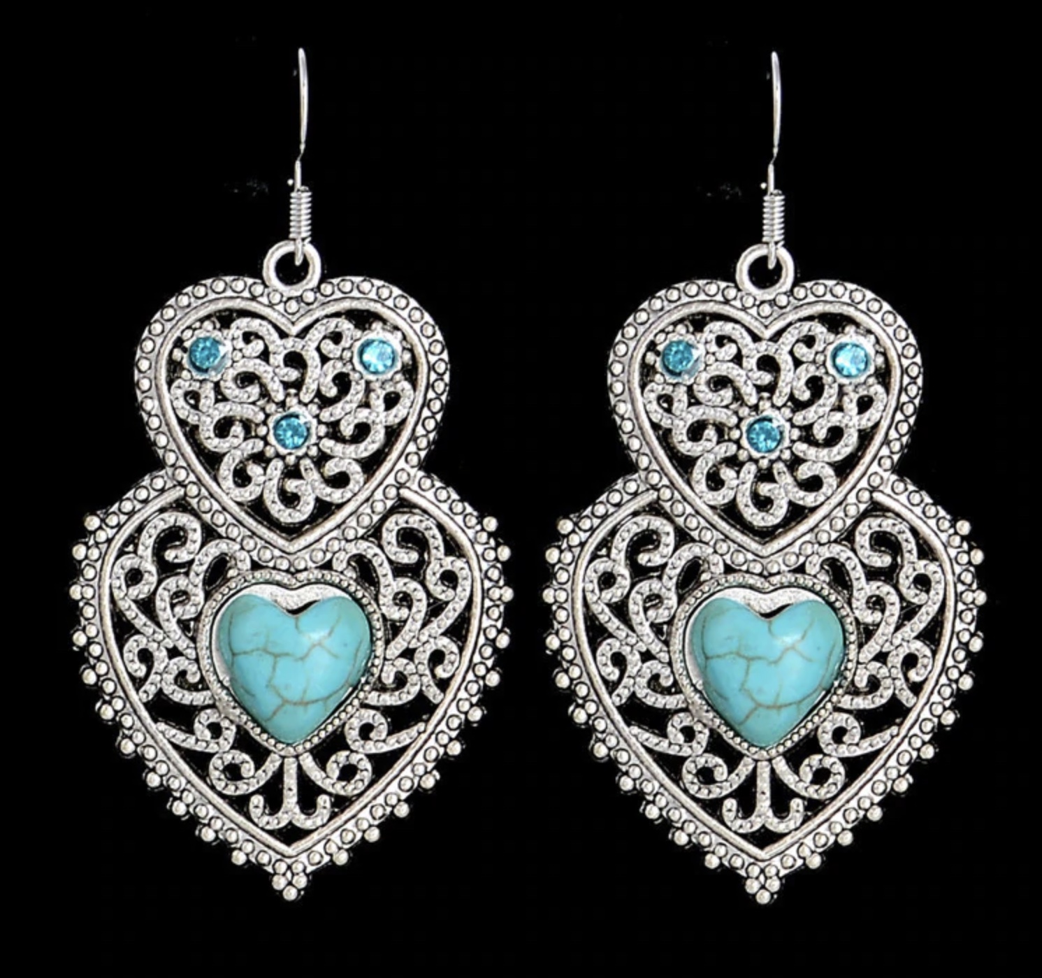 BOUCLES D'OREILLES 2 COEURS TURQUOISE BOHO BOHEME CHIC.