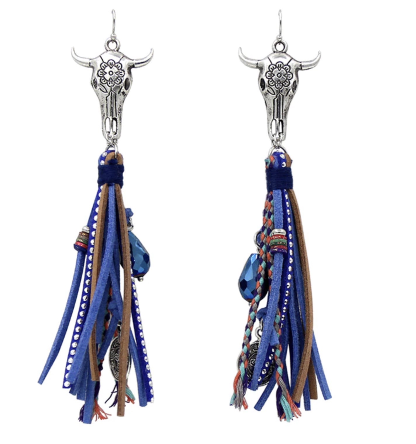 BOUCLES D'OREILLES FRANGES TETE CERF BOHO BOHEME CHIC.