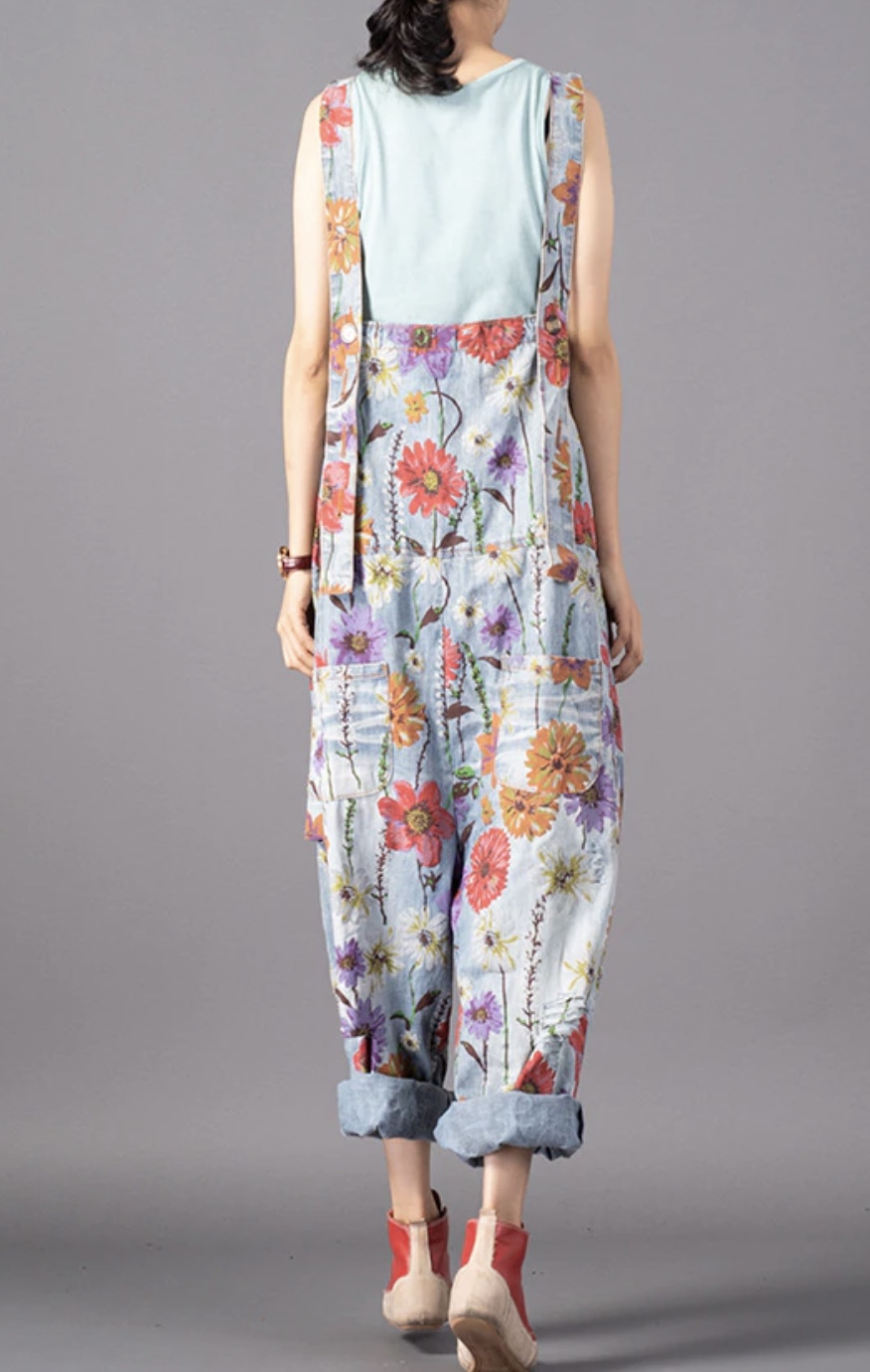 COMBINAISON JEANS IMPRIMEE FLEURS AMPLE BOHO BOHEME CHIC.