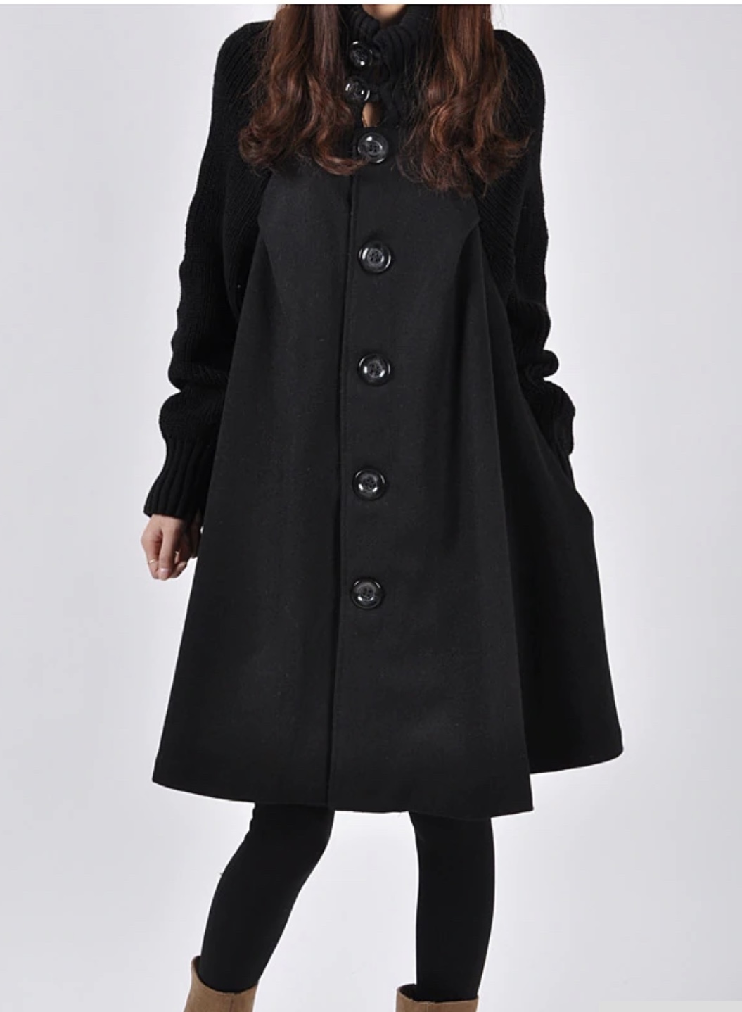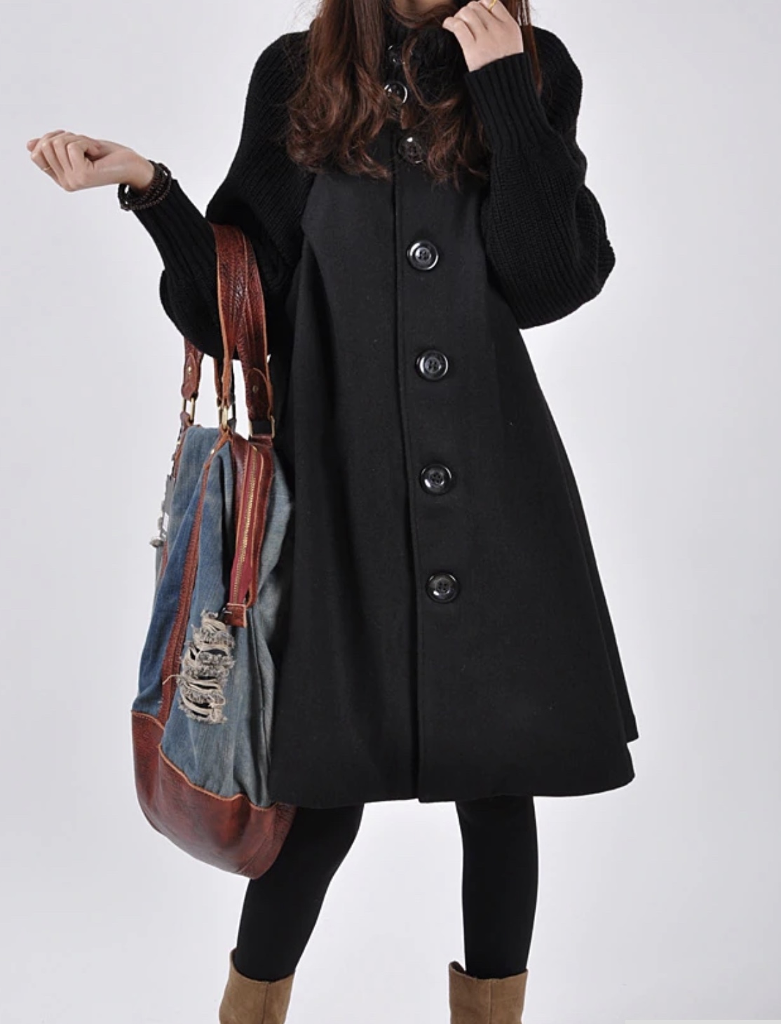 MANTEAU COURT NOIR LAINE ET POLYESTER EVASE BOHO BOHEME CHIC.