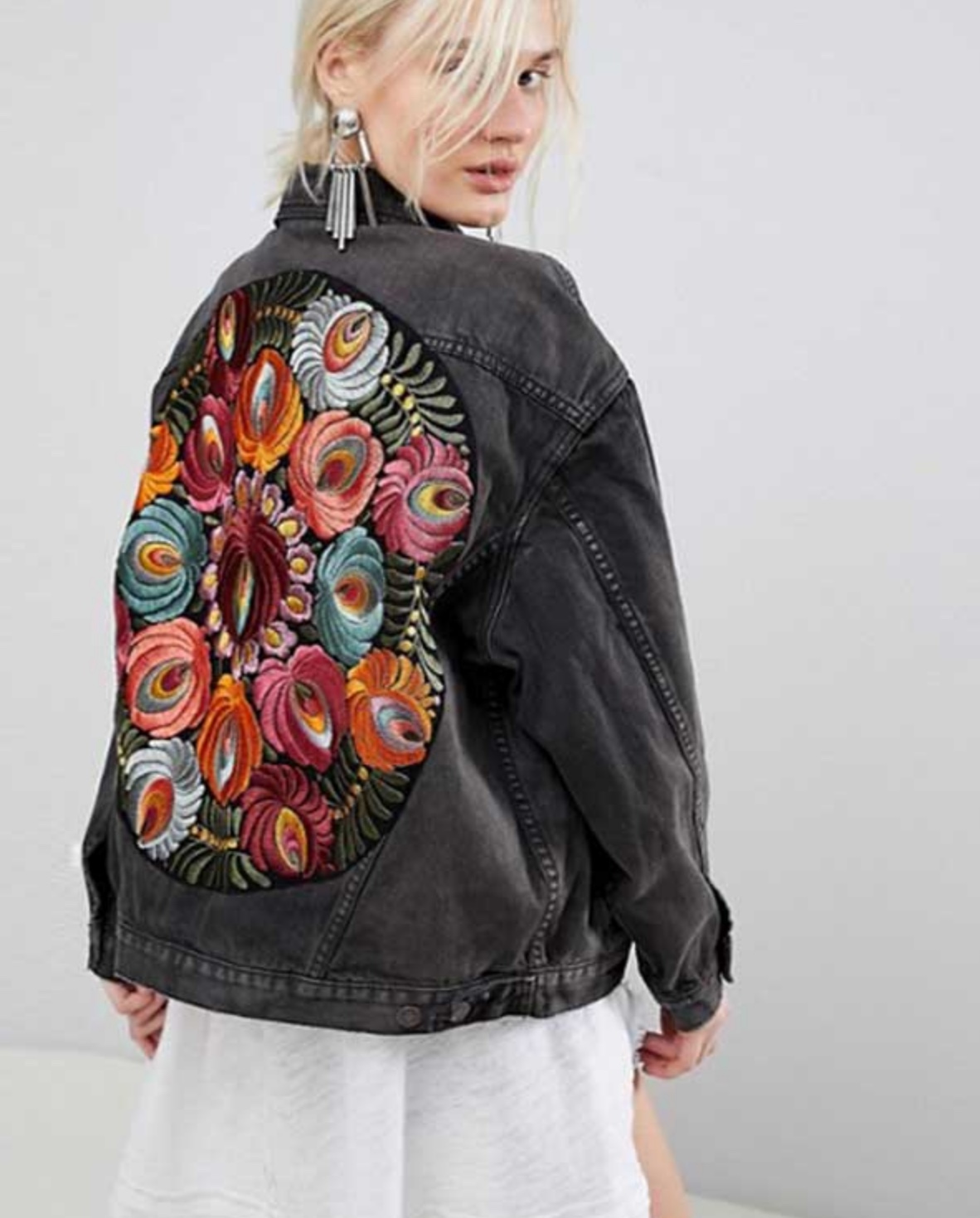 VESTE JEAN NOIRE DOS BRODE BOHO BOHEME CHIC.