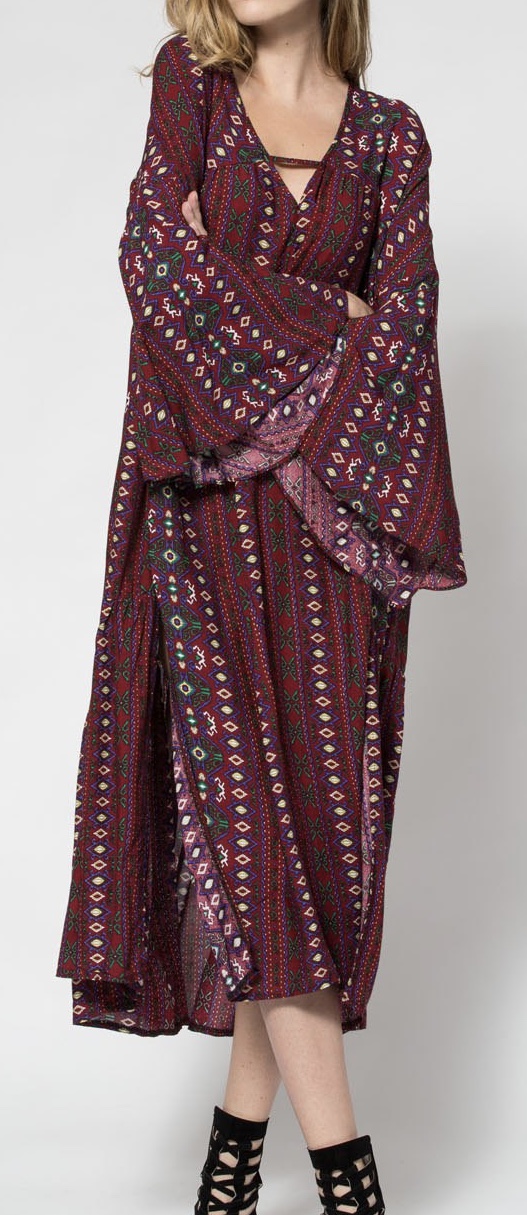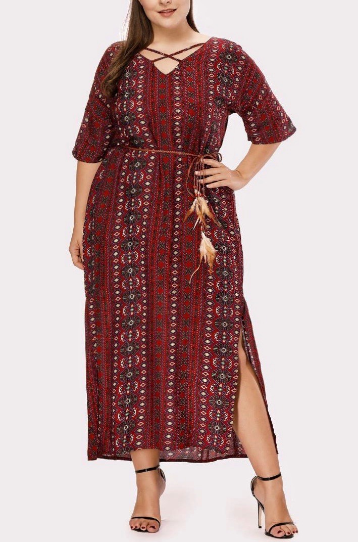 ROBE MI LONGUE IMPRIME RETRO VINTAGE + LIEN PLUMES BOHO BOHEME CHIC.